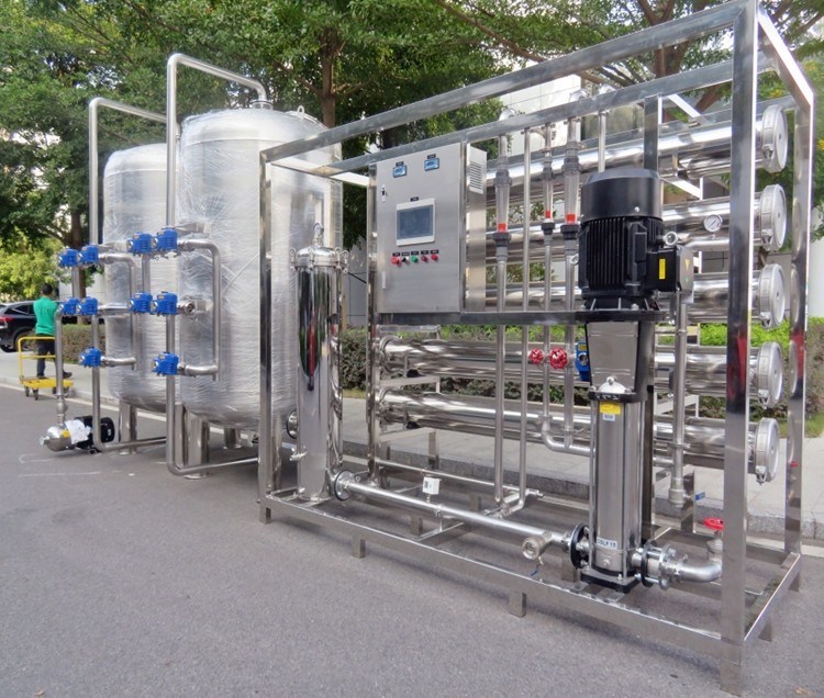 Pabrik reverse osmosis industri mencakup prefilter multimedia, pelembut air atau sistem dosis antiscalant, sistem dosis deklorinasi, unit reverse osmosis dengan membran semi-permeabel, dan sterilisasi ultraviolet atau klorinasi pasca sebagai pasca perawatan. Mesin RO ini menerapkan teknologi reverse osmosis dengan mengangkut air umpan melalui prefilter multimedia untuk menghilangkan partikel yang lebih besar dari 10-mikron. Kemudian air disuntikkan dengan bahan kimia antiscalant untuk mengontrol pengotoran kekerasan yang dapat menyebabkan kerusakan pada membran mesin RO. Pilihan pra-perawatan ini memiliki kemampuan untuk menghilangkan kekerasan, klorin, bau, warna, zat besi, dan belerang. Air kemudian berlanjut ke unit reverse osmosis di mana pompa bertekanan tinggi memberikan tekanan ekstrem pada larutan yang sangat pekat, memisahkan sisa garam, mineral, dan kotoran yang tidak dapat ditangkap oleh pre-filter. Air segar dan layak minum keluar dari ujung membran bertekanan rendah sementara garam, mineral, dan kotoran lainnya dibuang ke saluran pembuangan di ujung lainnya. Terakhir, air dilewatkan melalui sterilisasi UV (atau klorinasi pasca) untuk membunuh bakteri dan mikroba apa pun yang masih ada di dalam air.